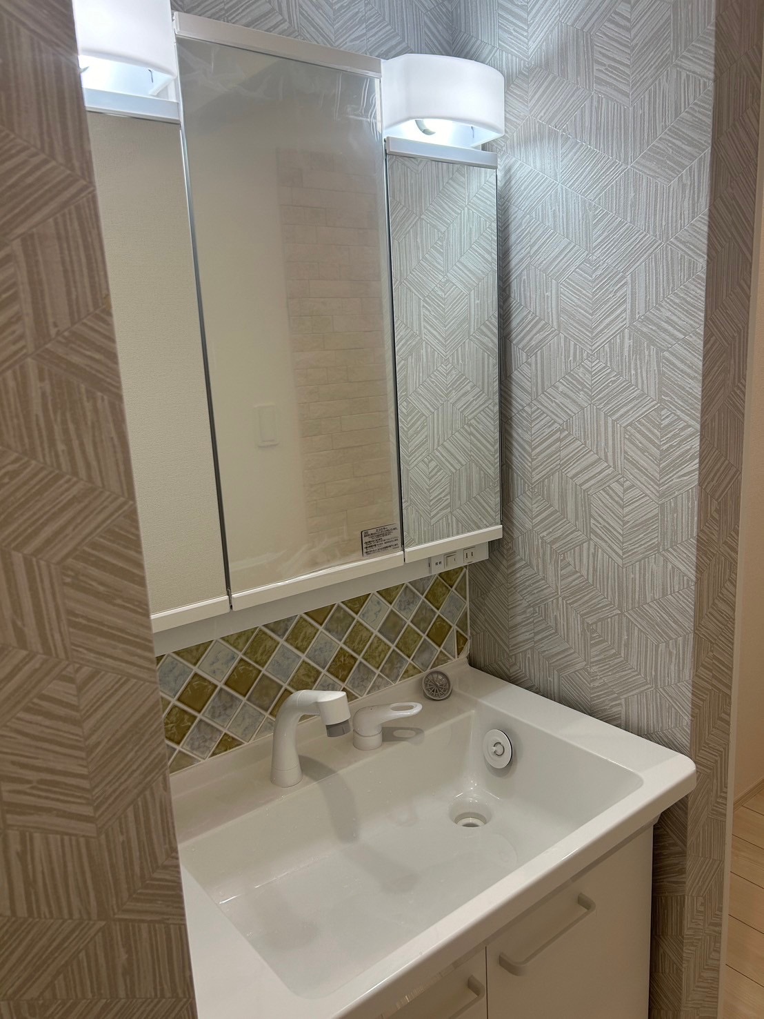 デザイン性を高めたいというご要望でしたので、ご指定のクロスとタイルを施工しました。モザイクタイルを貼ることにより防汚性が高まり、デザイン性と機能性の両方を両立することが実現し、毎日気持ちよく使っていただける洗面空間になりました。