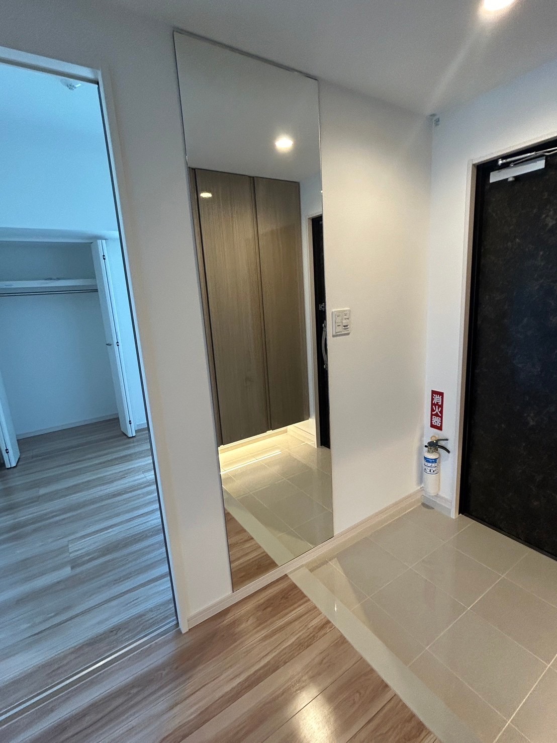 お客様の生活動線と光の入り方を考慮し、玄関正面に姿見ミラーを設置しました。シンプルなデザインながら空間を広く見せる効果があり、実用性と見た目の両方に満足いただける仕上がりになりました。