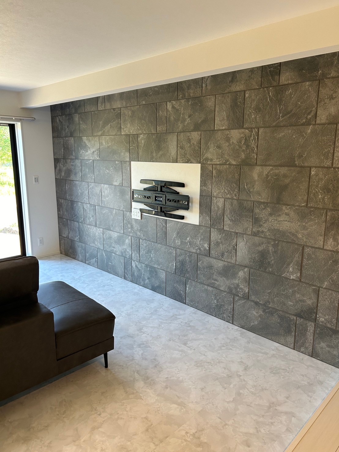 大人気のサンティエのエコカラットをテレビ背面に施工しました。ソファに座った際にちょうどいい高さに調整を行い、落ち着いたトーンでありながら、照明の陰影が映える仕上がりです。