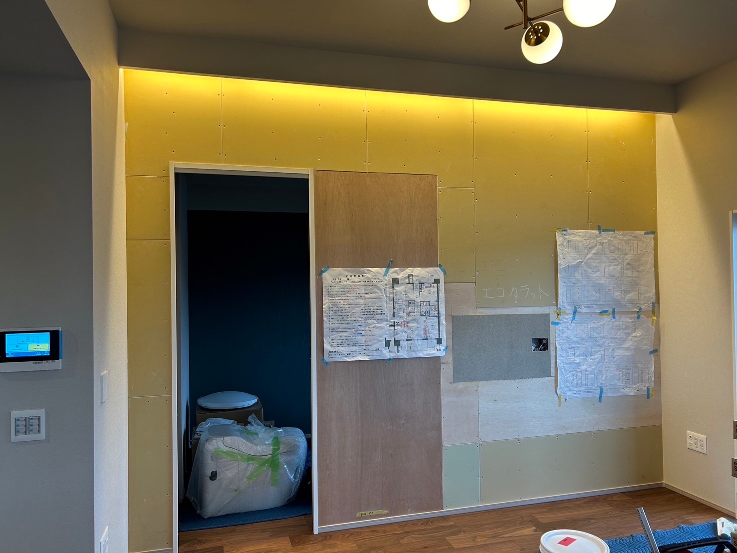 お客様がお選びになったエコカラットをテレビ背面に施工しました。デザインと陰影のバランスが整い、上品でまとまりのあるリビングに仕上がりました。