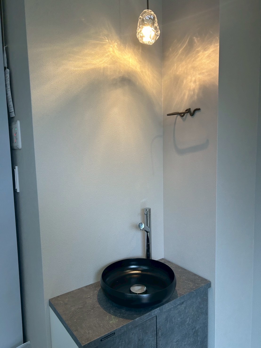 お客様にお選びいただいたタイルを、洗面台のサイズや照明の位置に合わせて丁寧に貼り合わせました。光のあたり方で柔らかな表情が出て、清潔感のある空間に仕上がっています。シンプルながらに印象に残る、洗面まわりになりました。