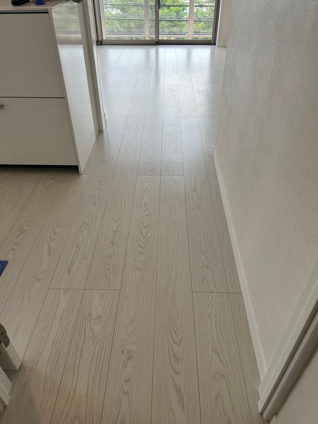 お部屋全体を明るい雰囲気にしたくて、光沢が出るUVコーティングを選びました。完成後の床は照明や光がきれいに映り込み、思っていた以上に高級感が出て驚きました。お掃除も楽になり、汚れがサッと落ちるので毎日のお手入れがストレスなくできています。ありがとうございました。