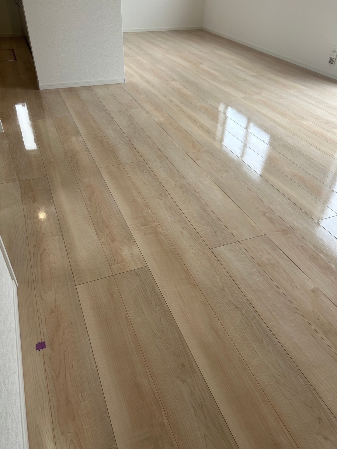 ペットと暮らすご家庭では、滑り防止とキズ対策が特に重要になります。UVコーティングは耐久性が非常に高く、ワンちゃんの足跡や汚れも拭くだけで簡単に落ちます。床の艶を長く保ちながら、快適な空間を守ることができました。明るい木目の床に美しい光沢が映えて、温かみのある仕上がりになっています。