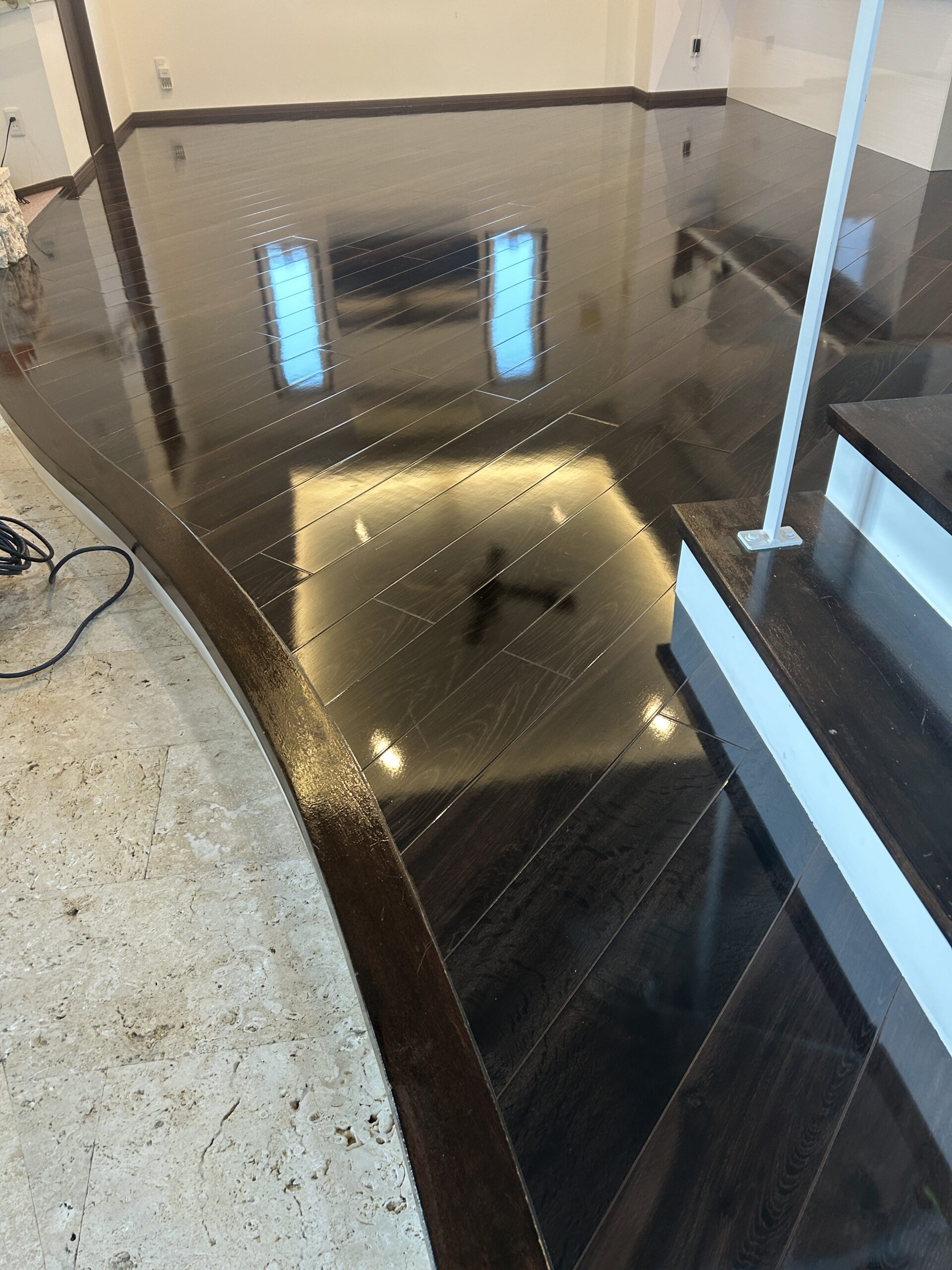 ペットの滑り防止を重視して、UVコーティングを採用しました。UVは瞬時硬化で仕上がるため、乾燥時間を待たずに当日中に歩行可能です。高級感ある光沢を保ちながら、耐久性・清掃時にも優れた仕上がりになりました。